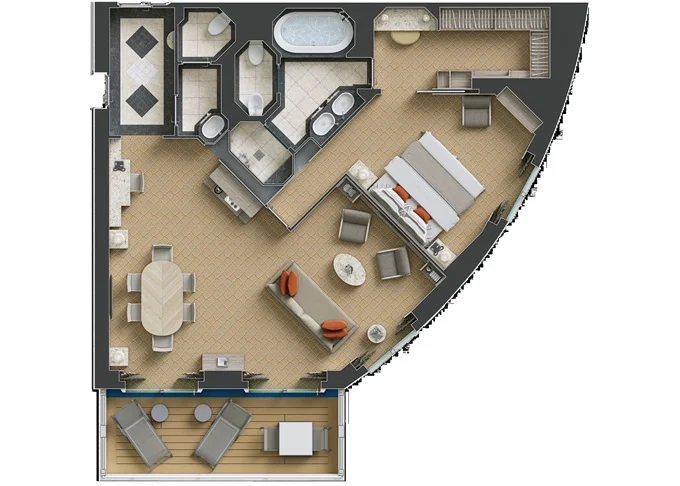 R1 - Royal Suite 1 105 m² (vrátane balkónu). 7. paluba vpredu. Max 3 osoby. 30 200 € 15 100 € za osobu
