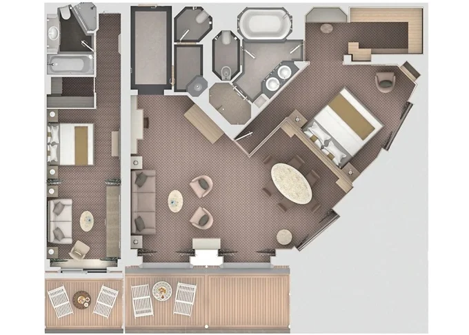 R1 - Royal Suite 1 105 m² (vrátane balkónu). 7. paluba vpredu. Max 3 osoby. 45 300 € 15 100 € za osobu